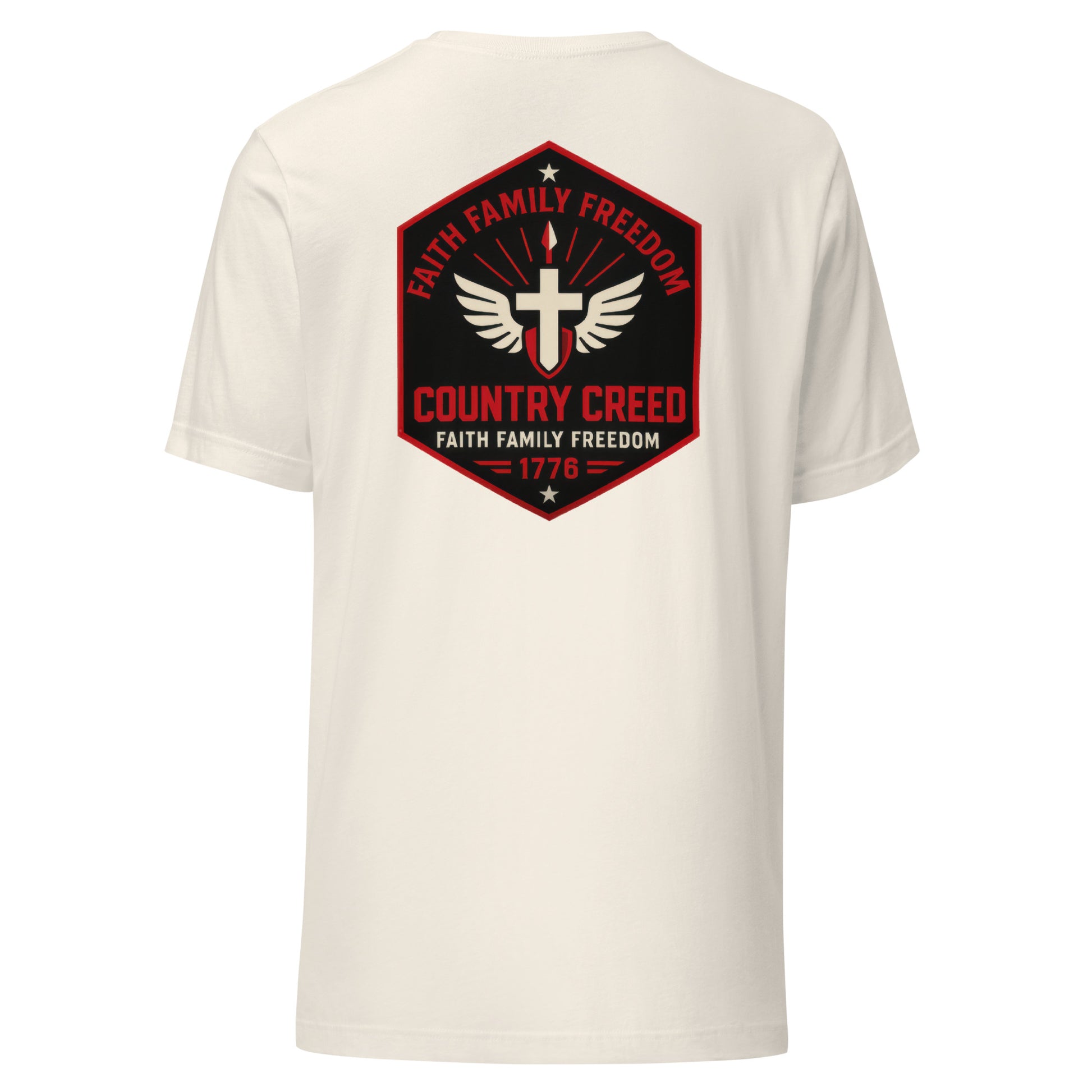 Wear your values like armor with the Faith Family Freedom t-shirt — a bold emblem of unwavering faith, fierce patriotism, and timeless American principles. This hexagon badge design features a striking cross with angelic wings, a warrior’s spear, and the battle cry: Faith, Family, Freedom. Framed in red and black with the founding year 1776, it’s the perfect fusion of Christian conviction and American grit.